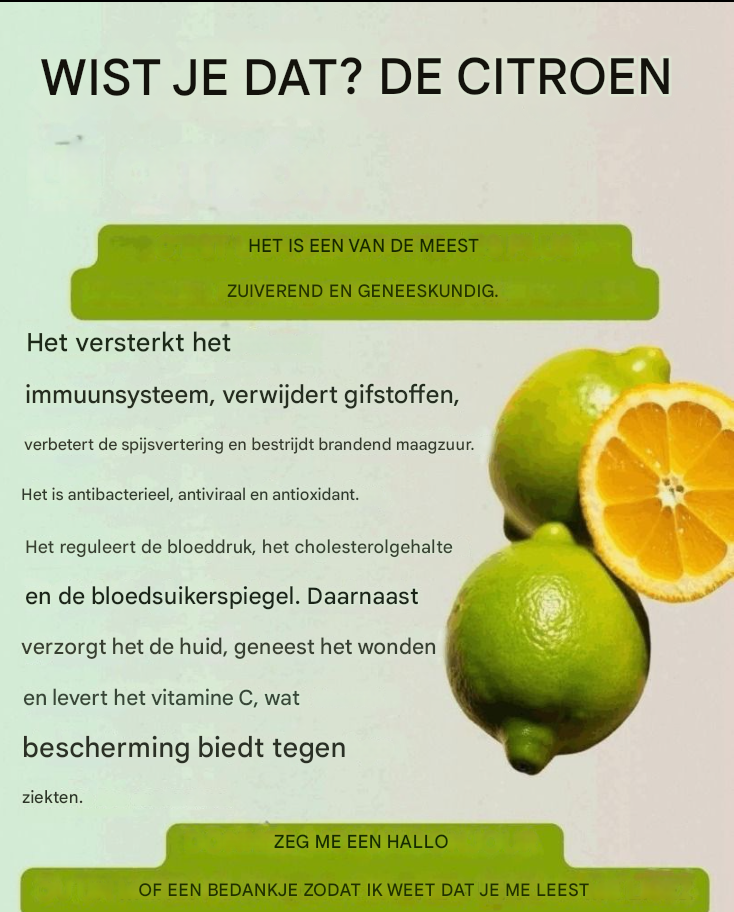 Citroen is een van de bekendste vruchten ter wereld, niet alleen vanwege zijn pittige en verfrissende smaak, maar ook vanwege zijn vele medicinale en culinaire deugden. Sinds de oudheid gebruikt in de keuken en natuurlijke geneeskunde, blijft het een waardevolle bondgenoot voor gezondheid en welzijn.