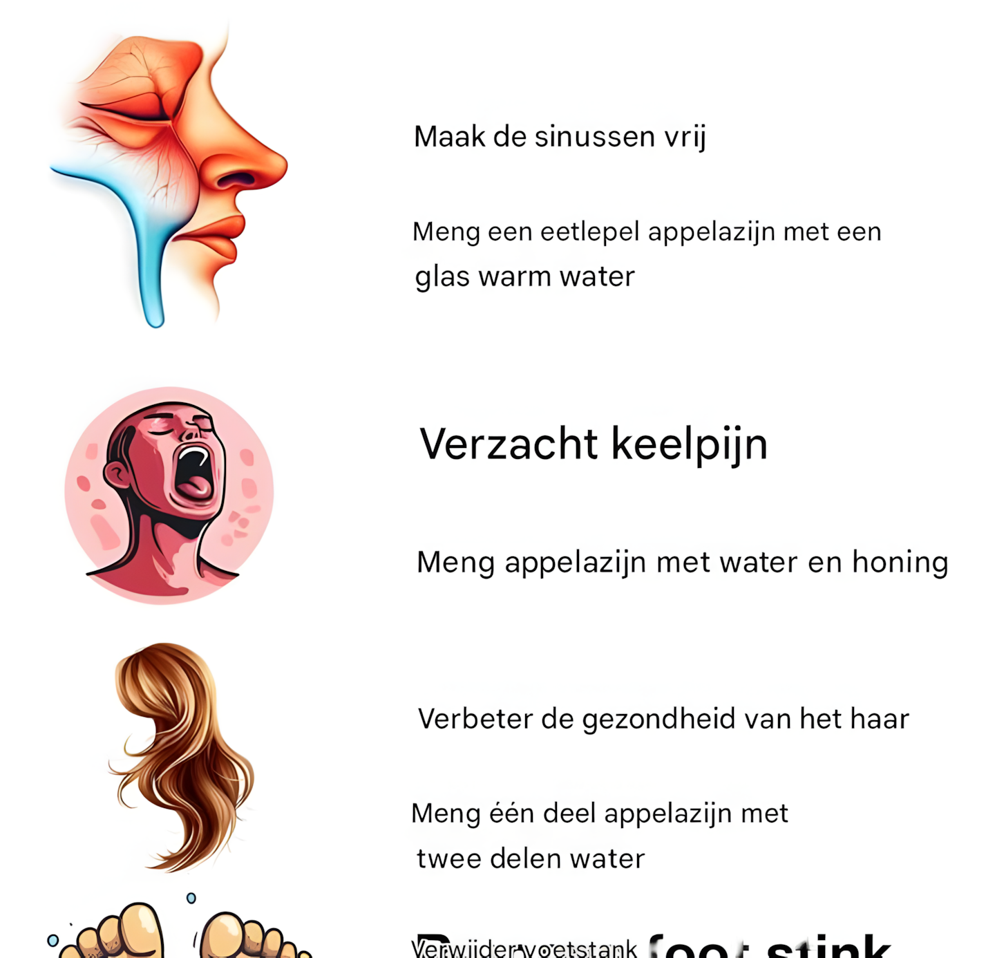 Appelazijn kan helpen bij het vrijmaken van bijholten dankzij het vermogen om slijm op te lossen en de antibacteriële eigenschappen. Om het te gebruiken voor verlichting van bijholteontstekingen, meng je een eetlepel appelazijn met een glas warm water en drink je dit op. Dit kan het slijm verdunnen, waardoor het gemakkelijker wordt om uit te scheiden en de verstopping van de bijholten vermindert. Sommige mensen inhaleren ook de stoom van heet water gemengd met appelazijn om hun neusholten vrij te maken.