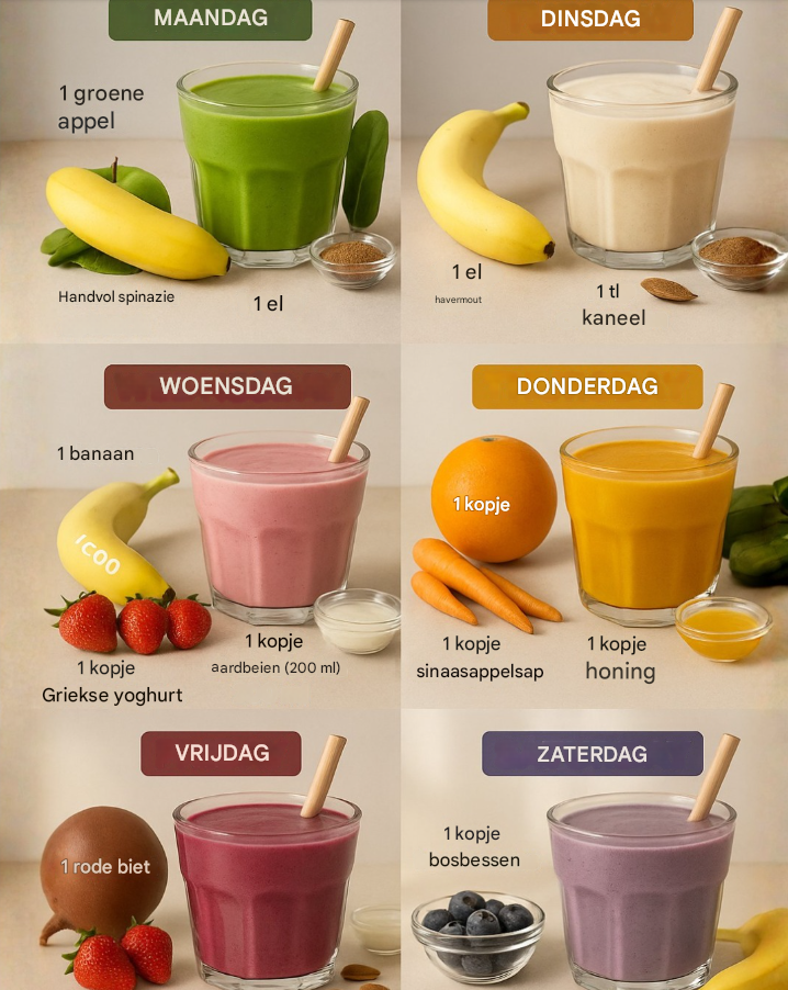 Ochtenden kunnen gehaast aanvoelen, en tijd vinden om iets voedzaams te bereiden staat vaak op de tweede plaats ten gunste van gemak. Het resultaat? Je pakt uiteindelijk wat het snelst is, ook al voel je je halverwege de ochtend traag aan. Wat als er een eenvoudige manier was om van levendige, frisse smaken te genieten terwijl je lichaam de natuurlijke boost krijgt waar het naar verlangt? Lees verder, want het kleurrijke 7-dagen smoothieplan hieronder kan zomaar je nieuwe favoriete ochtendritueel worden.