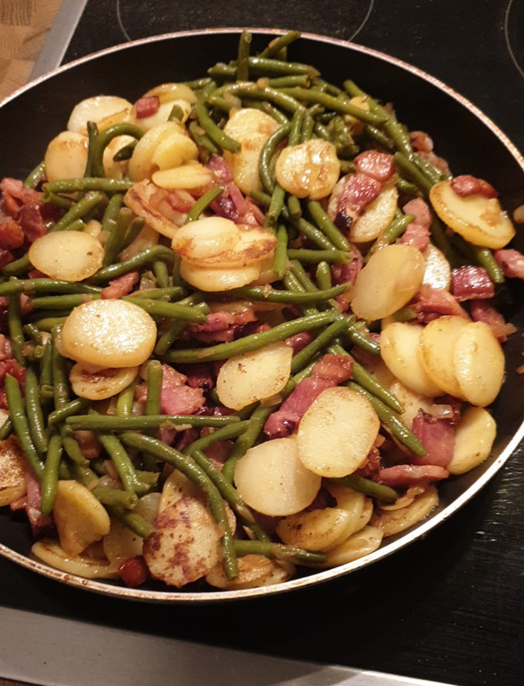 Dit eenvoudige, hartige aardappelpannetje met sperziebonen, spek en ui is zo’n gerecht dat altijd smaakt. Het combineert zachte aardappelschijfjes, beetgare groene boontjes en hartige spekjes met zoete, gestoofde ui. Het resultaat is een verwarmende, klassieke maaltijd waar je weinig ingrediënten voor nodig hebt — ideaal voor drukke avonden of als stevig comfortfood.