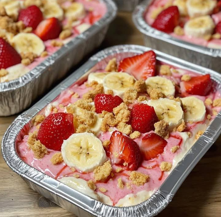 In een grote pan of losse bakjes legt u het puddingmengsel in laag, gevolgd door een laag geplette vanillewafels, plakjes bananen en aardbeienschijfjes.