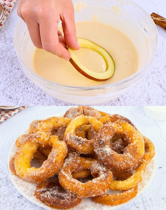 Doop de appelschijfjes in het voorbereide beslag en doop ze met hete olie in de pan. Bak ze aan beide kanten tot ze goudbruin zijn.