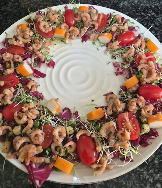 Ingrediënten Radicchio, fijngesneden Preischeuten Cressonnette (tuinkers) Cherrytomaten, gehalveerd Croutons Garnalen, schoongemaakt Citroensap Ahornsiroop Cocktailsaus Benodigdheden Grote mengkom Kleine kom of schaaltje voor de dressing Serveerschaal Bereidingswijze 1. Voorbereiden van de Dressing