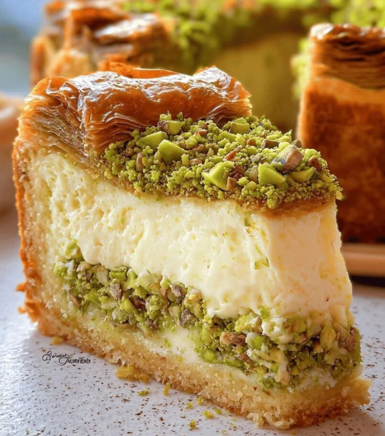 Cheesecake daarentegen vindt zijn oorsprong in het oude Griekenland, voordat het in de Verenigde Staten populair werd in zijn moderne, dichte en romige variant. Het idee van baklava cheesecake is ontstaan uit de wens om deze twee tradities te verenigen. Het heeft de zoetheid en romigheid van roomkaas, het aroma van honing, de knapperige textuur van filodeeg en de knapperigheid van pistachenoten. Dit dessert belichaamt de perfecte fusie tussen de twee werelden, voor een ervaring die zoet, geurig en getextureerd tegelijk is.