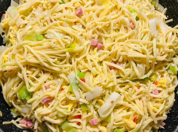 Dan de mie toevoegen en alles door elkaar husselen .