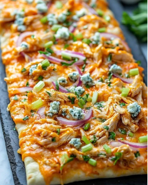 Bestrooi met mozzarella, blauwe kaas en rode uien.