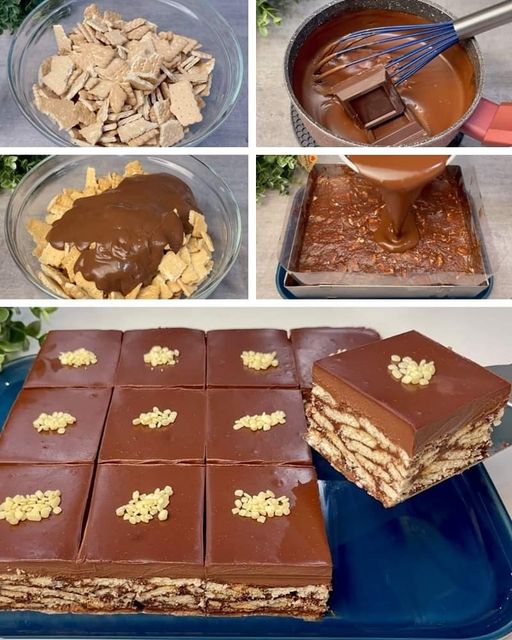 READ NEXT Zachte yoghurt en abrikozencake klaar in tien minuten Ingrediënten: 400 g digestive biscuits of Maria biscuits, in stukjes gebroken 200 g pure chocolade 200 g melkchocolade 200 ml slagroom 100 g boter 1 eetlepel honing Optioneel: gehakte noten voor garnering Instructies: vervolg op de volgende pagina