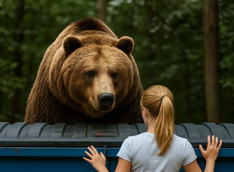 Ik zette een paar voorzichtige stappen naar voren. Ze reageerde niet – ze volgde alleen elke beweging die ik maakte. Toen ik dichterbij kwam, hief de beer plotseling haar zware poten op en begon hard op het deksel van de container te slaan. Alsof ze wilde zeggen: “Open!”