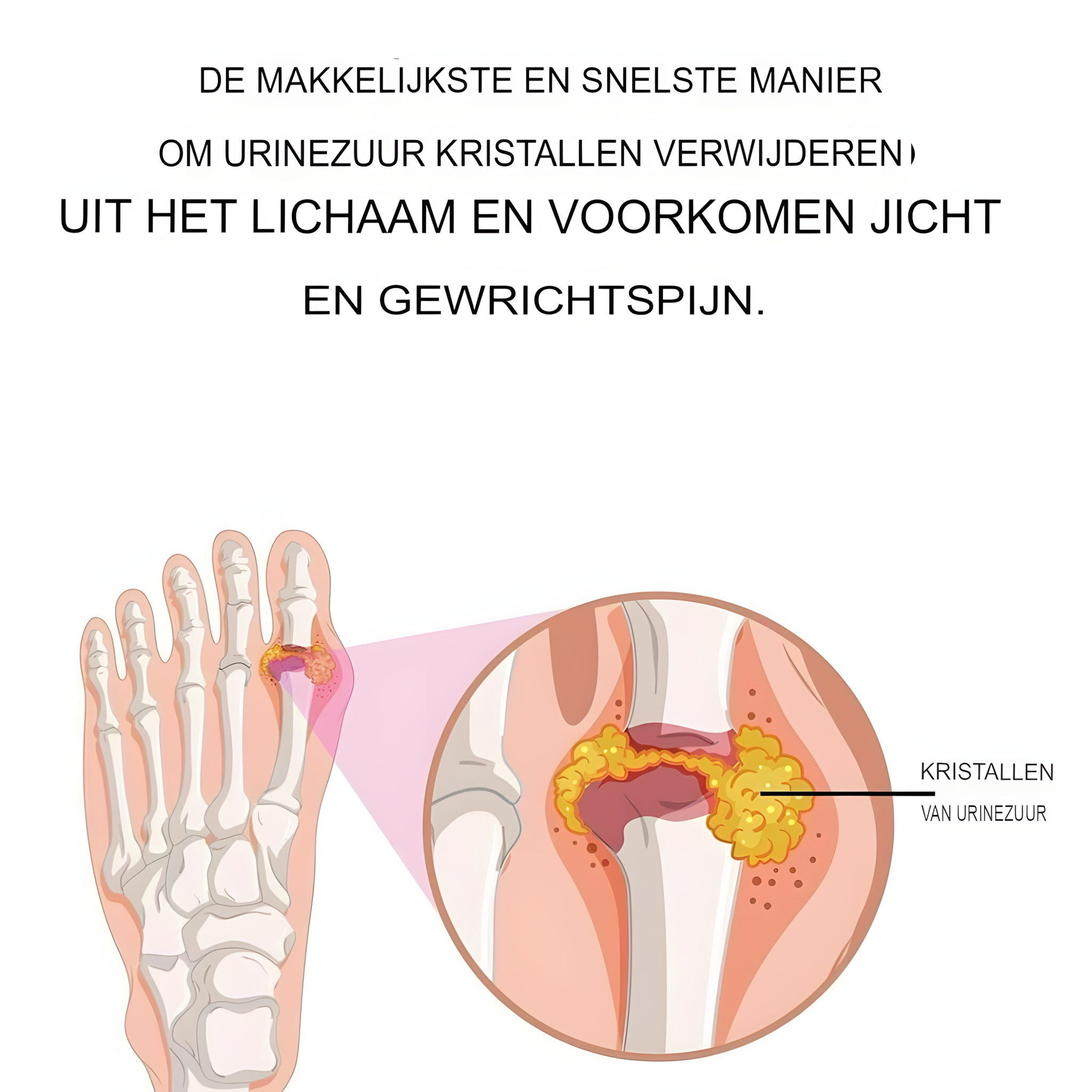 Urinezuur is een natuurlijk afvalproduct dat ontstaat bij de afbraak van purines – stoffen die voorkomen in bepaalde voedingsmiddelen. Als het lichaam te veel urinezuur aanmaakt of onvoldoende uitscheidt via de nieren, kunnen zich urinezuurkristallen vormen. Deze kristallen hopen zich op in gewrichten, vooral in de tenen, enkels en knieën, en veroorzaken pijnlijke ontstekingen: jicht.