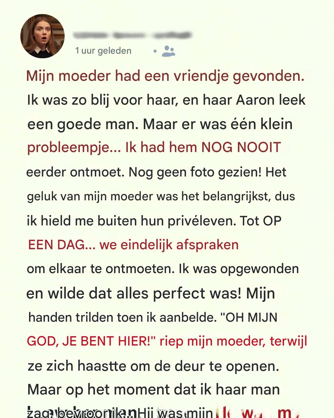 Toen ik ouder werd, moedigde ik mijn moeder vaak aan om een nieuw iemand te zoeken. Ze gaf toe dat ze zich eenzaam voelde, vooral tijdens die lange, stille avonden waarop het huis te groot leek voor één persoon. Dus toen ze me op een middag belde, haar stem borrelde van opwinding toen ze aankondigde dat ze een vriendje had dat ze wilde dat ik zou ontmoeten, was ik oprecht blij voor haar.