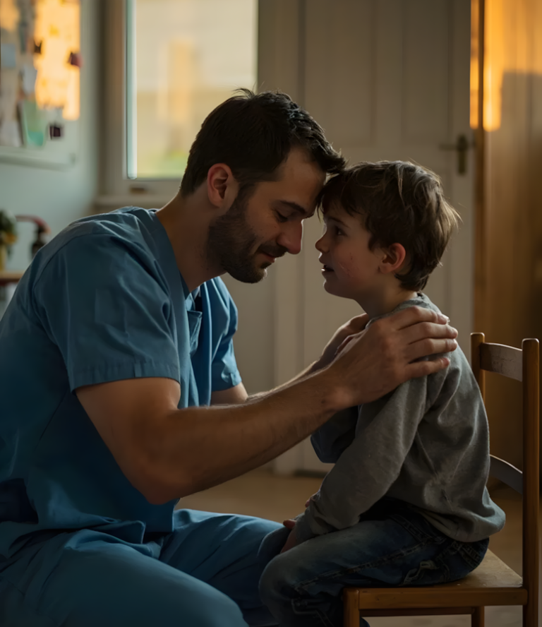De kamer van de verpleegster rook vaag naar ontsmettingsmiddel en kleurpotloden, een vreemde mix van kindertijd en medicijnen. En daar zat hij – mijn zoon, Ethan – klein en geschrokken op het veldbed. Zijn schouders trilden, zijn gezicht was bleek en vlak bij zijn oog was de vage omtrek van een blauwe plek te zien.
