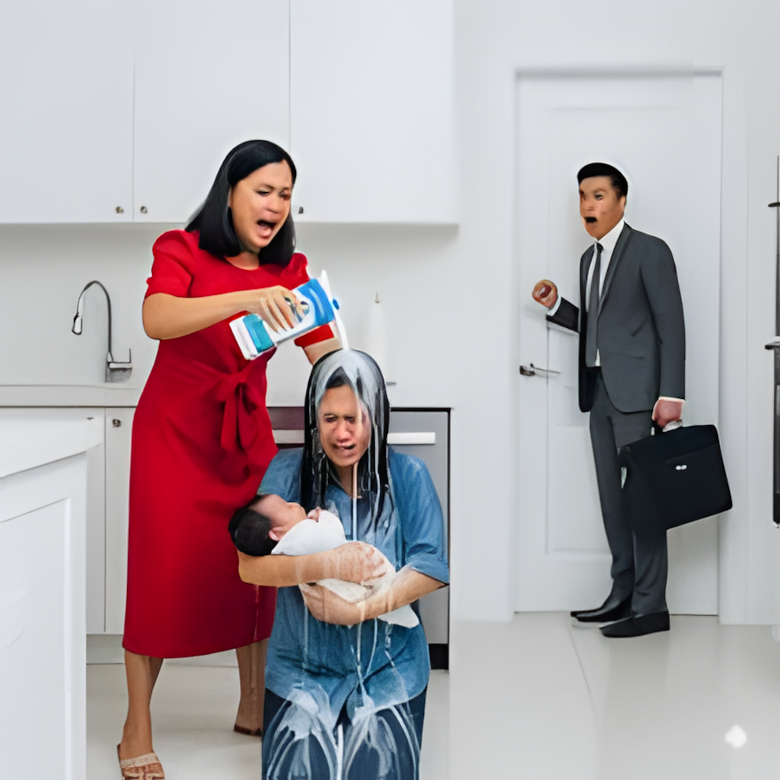 Emily zat op de tegelvloer, de melk druppelde uit haar haar, maakte haar jurk nat en vormde een plas onder haar. Ze wiegde Alex stevig in haar trillende armen en beschermde hem.