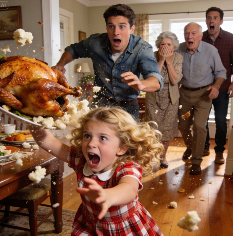 Voordat iemand kon reageren, wierp Lily zich naar voren. Haar kleine handjes grepen de ovenschaal met een kracht waarvan ik niet wist dat ze die had. De hele kalkoen — twaalf pond, vol, nog steeds dampend — stortte met een vochtig en catastrofale geluid op de vloer. De farce barstte los als splinters. De saus spatte op mijn schoenen.