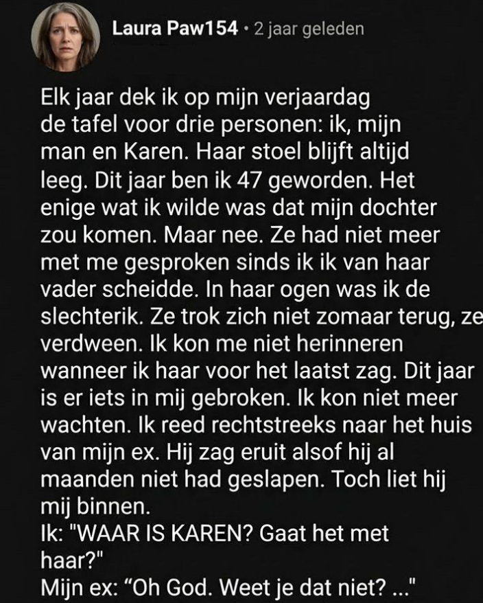 Er stonden drie borden op tafel: één voor mij, één voor mijn man Brad, en één voor de stilte. De derde plek was netjes gedekt, alsof ik met bestek en servetten iets kon oproepen wat al twee jaar niet meer in mijn leven bestond.