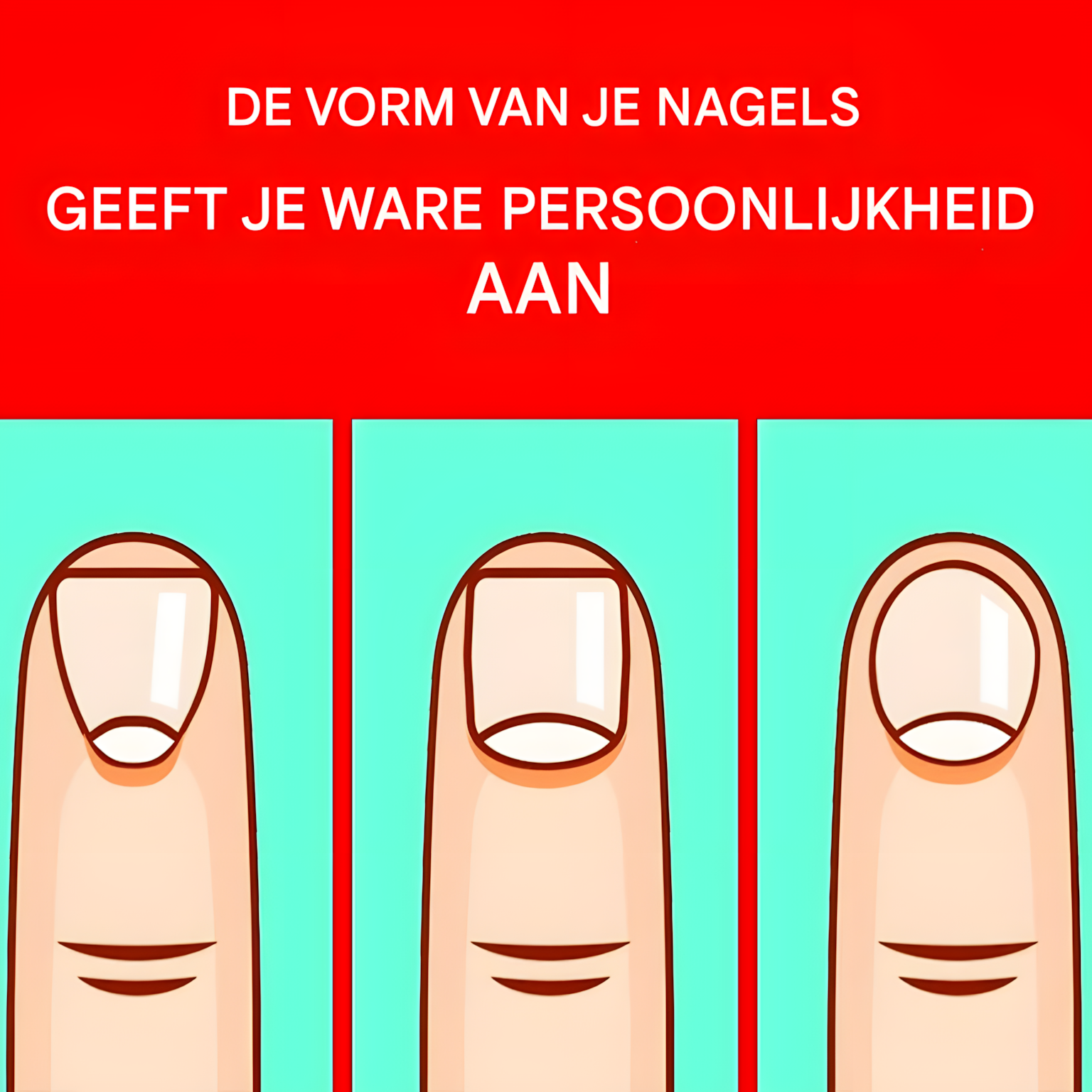Uw handen en de conditie van uw nagels kunnen veel informatie geven over uw levensstijl, de tijd die u besteedt aan de verzorging van uzelf en ook over uw persoonlijkheid. Als de manier waarop u uw nagels knipt u misschien onbelangrijk lijkt, weet dan dat het niet waar is. Hun vorm kan namelijk veel geheimen onthullen. Ontdek met deze test welke karaktereigenschappen jij hebt op basis van de vorm van je nagels.Vindt u het leuk om naar de schoonheidsspecialiste te gaan voor een manicure? Of verwaarloos je ze juist en denk je dat het onopgemerkt zal blijven? U zult zeker van gedachten veranderen zodra u ontdekt welke geheimen zij voor u hebben. De vorm van uw nagels kan inderdaad verschillende aspecten van uw persoonlijkheid onthullen. Bent u meer een onafhankelijk persoon? bepaald? Ben jij een leider of een volger? Ontdek het met deze test.Je hebt lange nagels