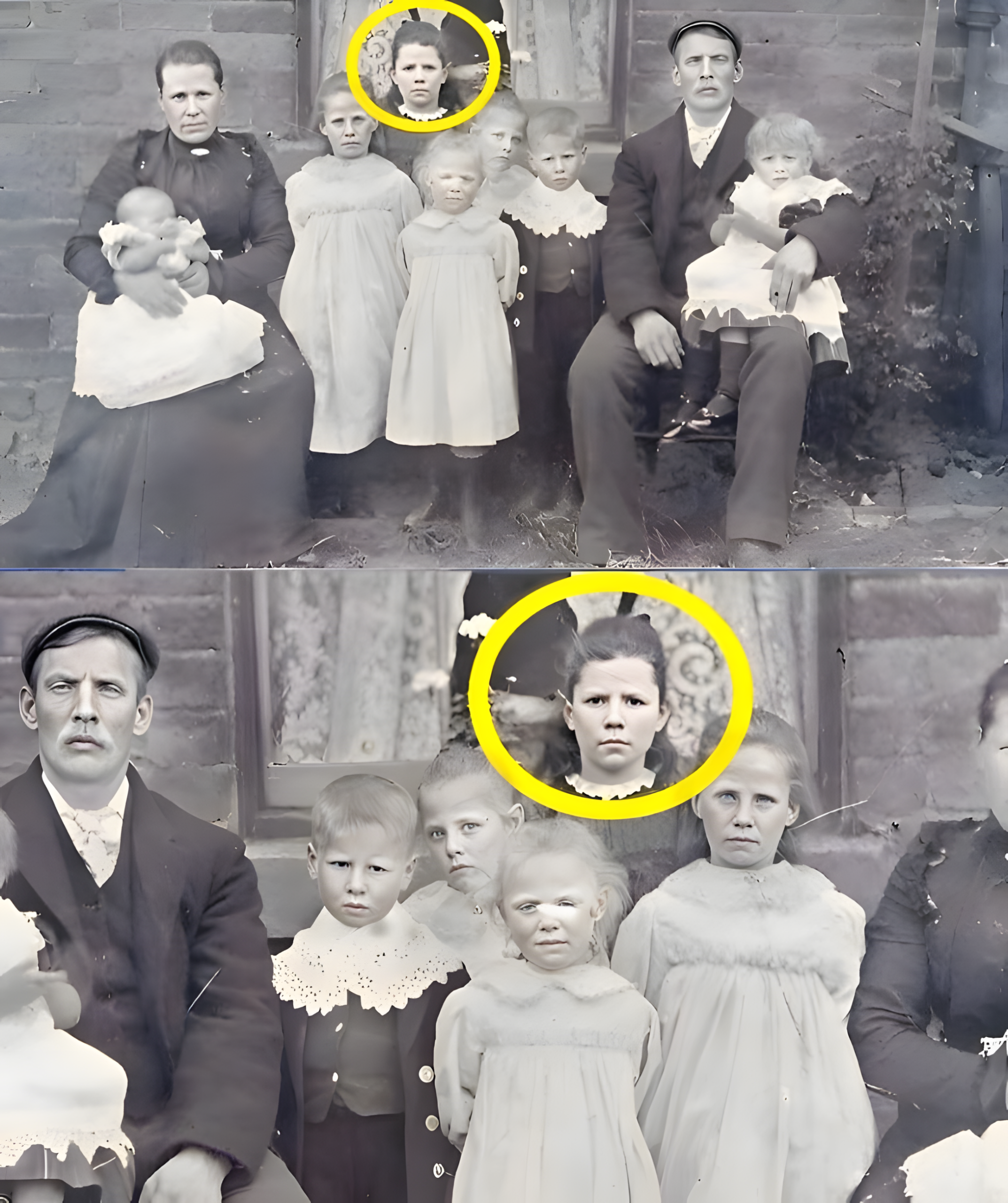 Stel je voor dat je een oude familiefoto vindt, beschadigd door de tijd en vergeeld door de jaren. Een ogenschijnlijk alledaags beeld: een vader, een moeder met een baby en vier brave kinderen voor een bakstenen muur. Niets bijzonders… Totdat er na digitale restauratie een detail opduikt.