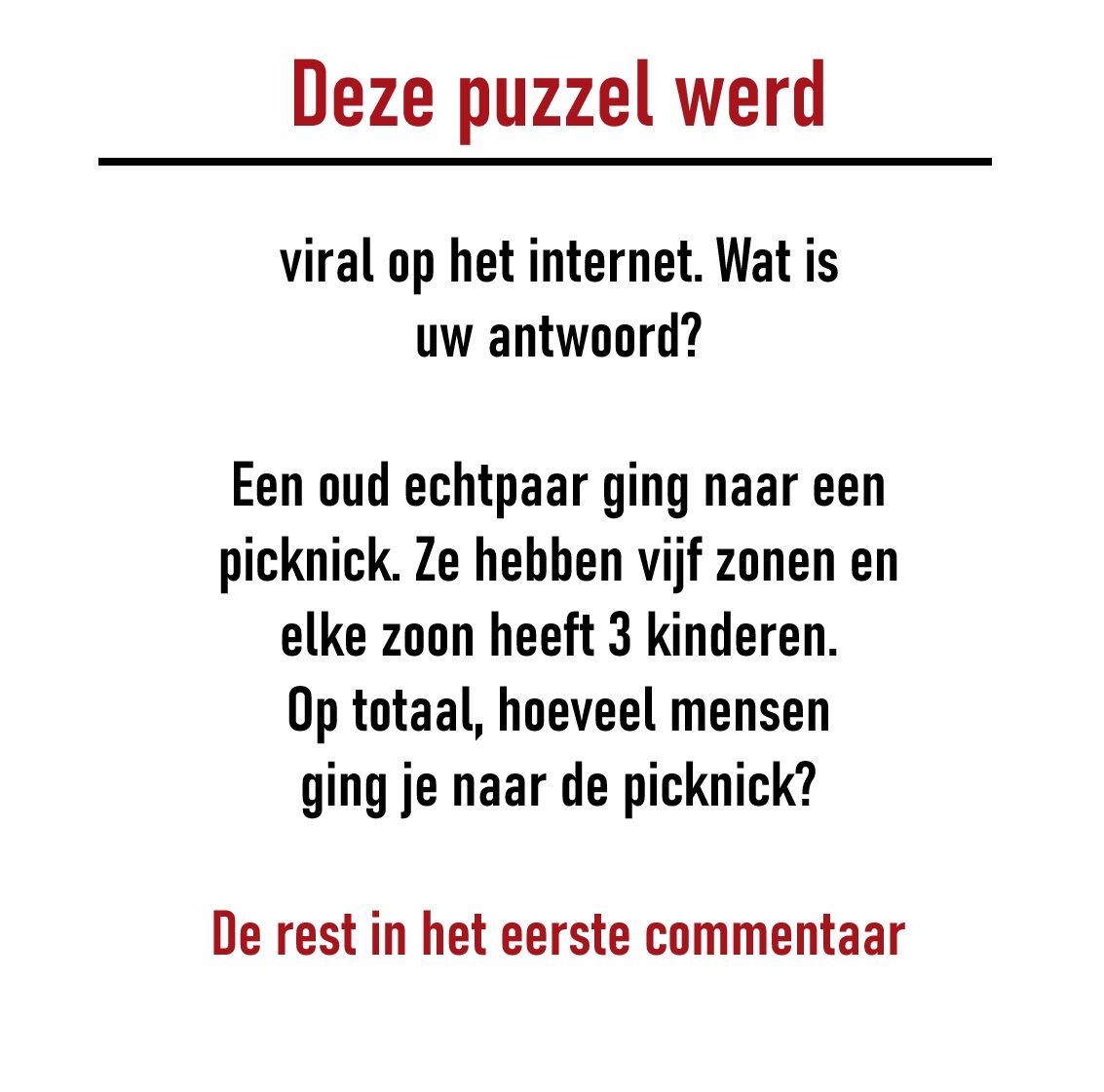 Een ouder echtpaar ging picknicken. Ze hebben 5 zonen, en elke zoon heeft 3 kinderen. Hoeveel mensen gingen er in totaal picknicken?