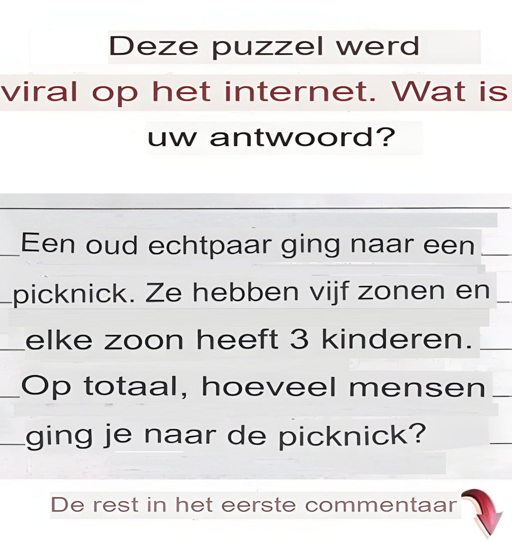 Een ouder echtpaar ging picknicken. Ze hebben 5 zonen, en elke zoon heeft 3 kinderen. Hoeveel mensen gingen er in totaal picknicken?