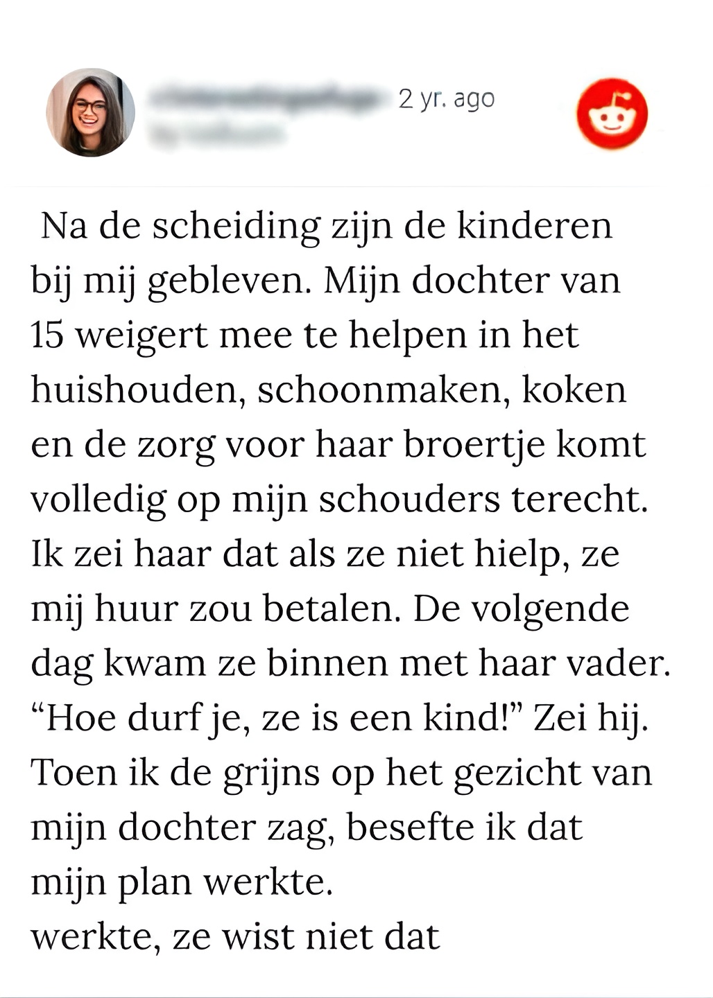 Ze legde uit dat, omdat haar dochter weigerde de klusjes te doen, ze de huur moest betalen om daar te wonen. De volgende ochtend kwam haar vader, boos vragend wat er aan de hand was omdat ze nog een kind was. Het meisje dacht dat hij haar kant zou kiezen, maar deze keer niet.