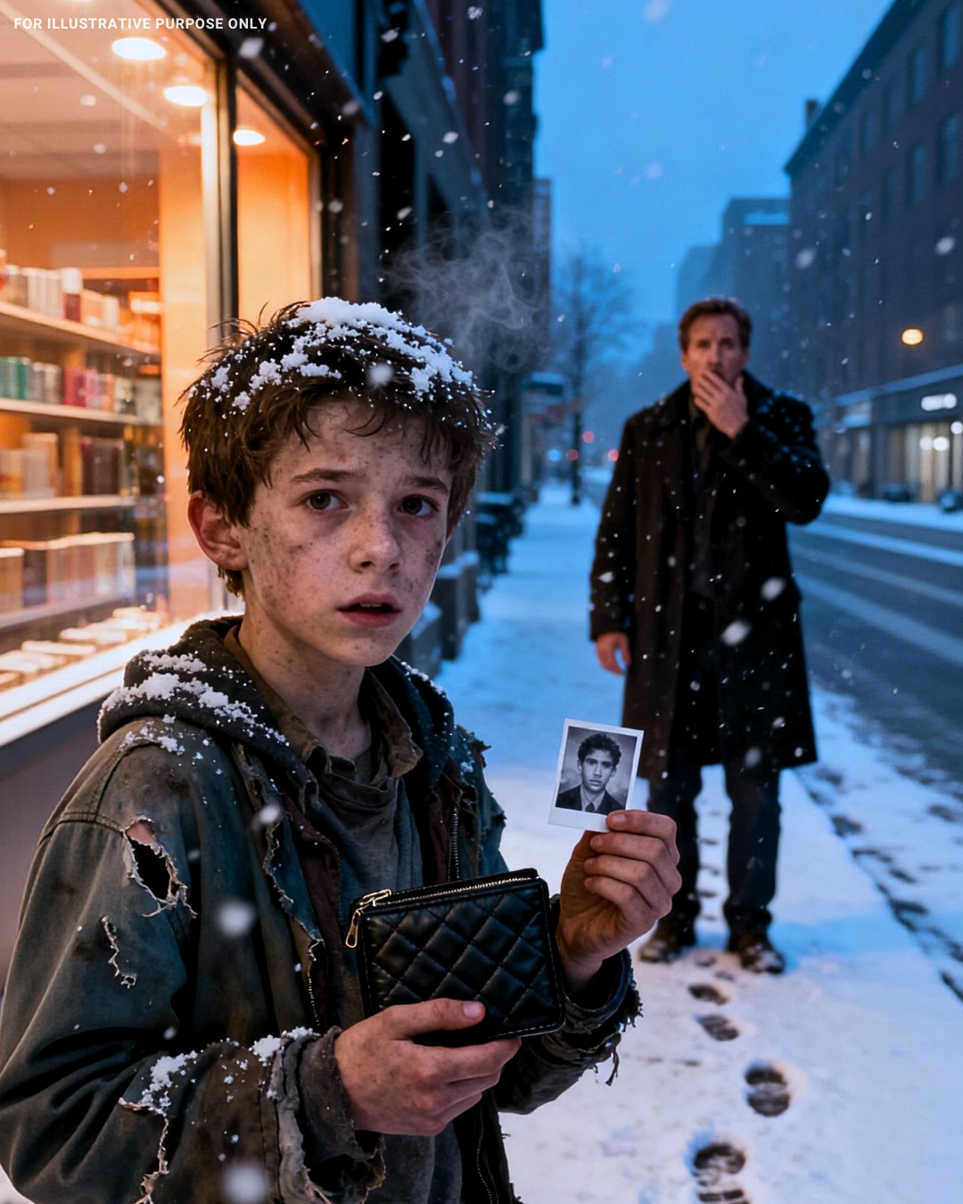 Ethan pakte het op, veegde de sneeuw eraf en keek om zich heen. Niemand merkte hem op. Toen hij het voorzichtig opende, sloeg zijn hart over – niet vanwege het geld, maar vanwege een foto die in een verborgen zak zat.