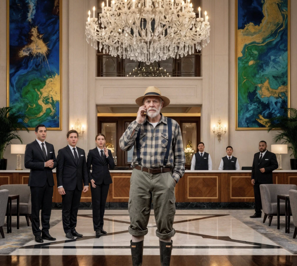 De jonge receptioniste, met haar felrode lippenstift, bekeek hem van top tot teen en fronste. In haar ogen was een vijfsterrenhotel alleen voor elegante en ‘succesvolle’ mensen, niet voor boeren in vuile kleren. Ze schraapte haar keel en zei koud: