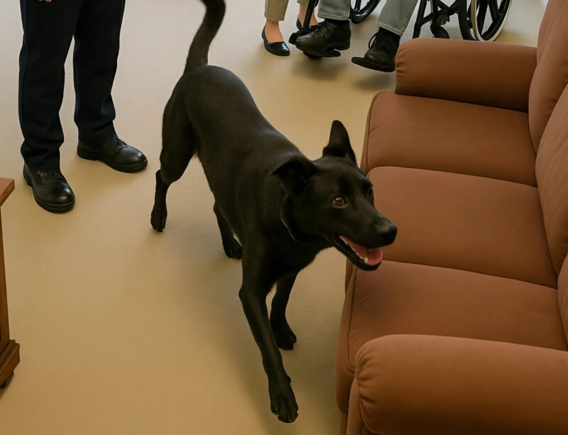 De hond stopte bij de bank, de vacht op zijn nek rees overeind, en plots begon hij te grommen. Een seconde later sprong hij met luid geblaf op de zachte kussens en drukte zijn snuit in de stof. De eigenaren hapten naar adem, en de politieagent fronste: