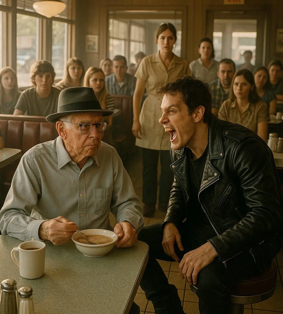 Een motorrijder bespot een oudere man – waarna het hele restaurant stil werd van wat er daarna gebeurde
