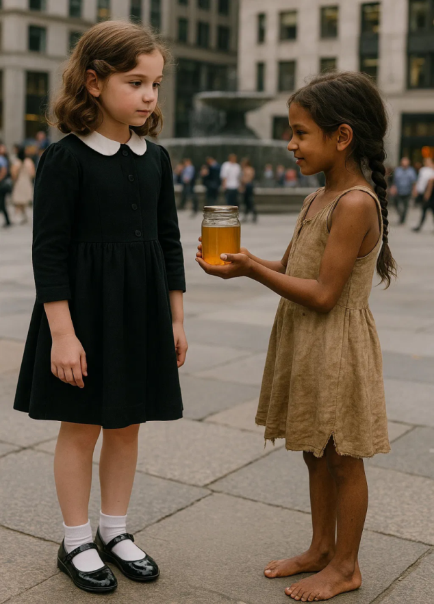 De vreemdeling glimlachte verlegen. « Ik heet Zuri, » fluisterde ze. « Dit is niet zomaar honing. Mijn oma zei dat het hoop geeft. Het helpt je te uiten wat er vanbinnen vastzit. » Ze hield de pot met trillende vingers omhoog.