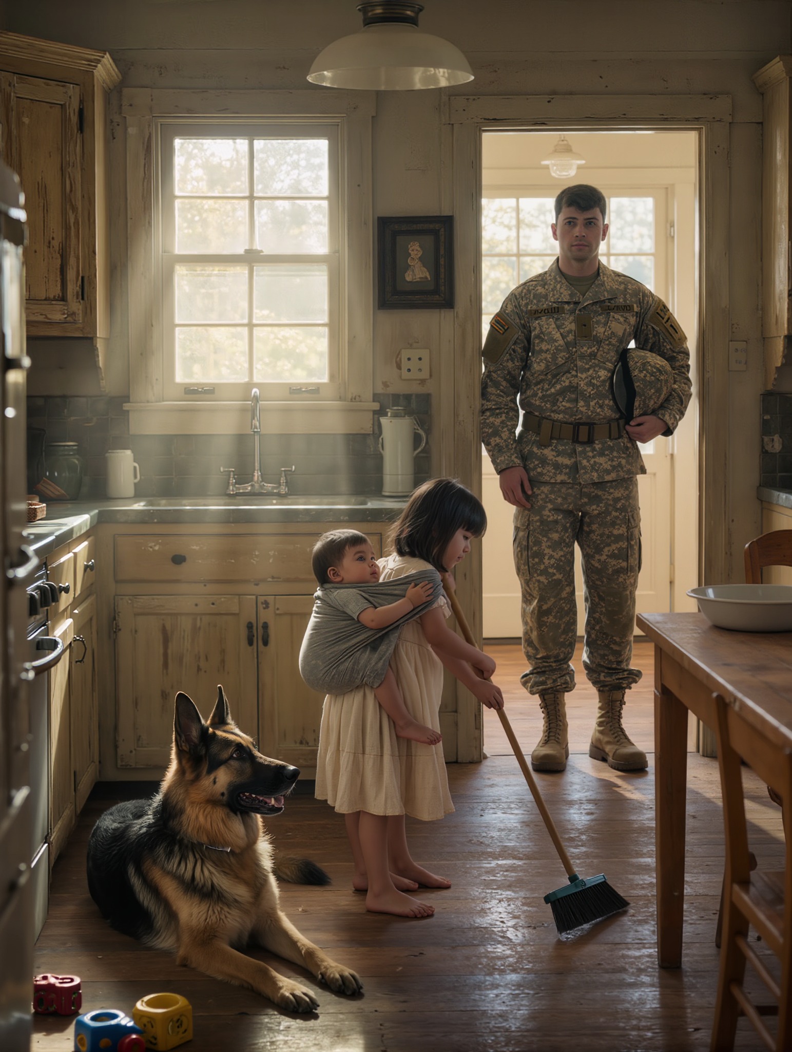 De herfstlucht in Virginia droeg de geur van brandende bladeren met zich mee toen sergeant Daniel Hayes eindelijk uit de bus stapte. Zijn uniform was gestreken maar verschoten, zijn laarzen versleten door het woestijnzand van Afghanistan. Hij was bijna twee jaar weggeweest en telde de dagen af ​​tot hij zijn familie weer zou zien. Toch werd hij, toen hij het kleine huis aan Oakwood Street bereikte, niet begroet door de warme omhelzing van zijn vrouw, maar door iets wat hem deed huiveren.