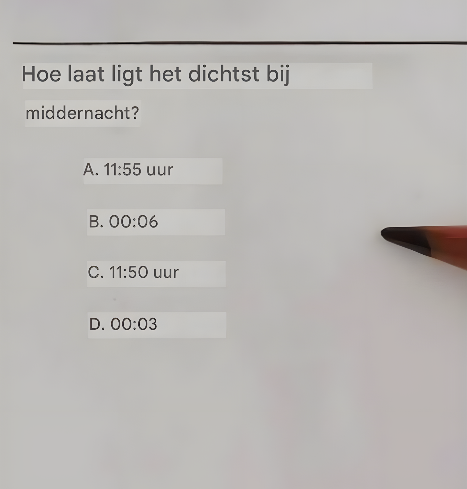 🔍 De vraag: Welke tijd ligt het dichtst bij middernacht (00:00)?