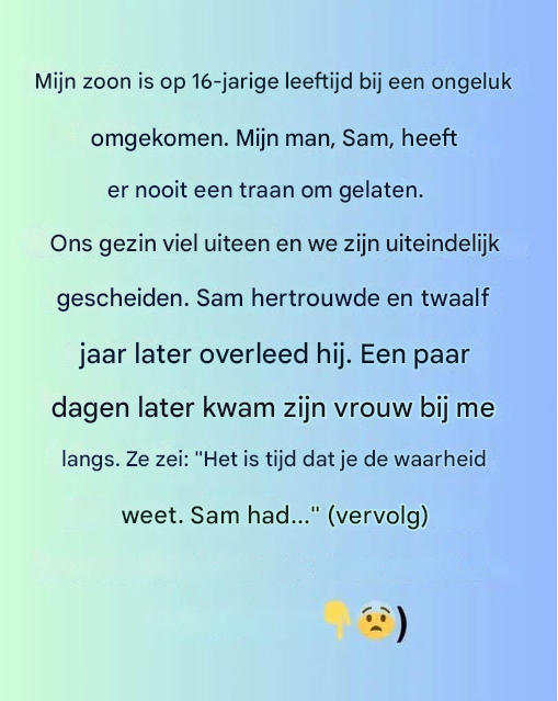 Ik verloor mijn zoon bij een tragisch ongeluk toen ik 16 jaar oud was. Mijn toenmalige man, Sam, bleef afstandelijk en toonde nooit emotie. Ons gezin kon dit verlies niet weerstaan en we zijn gescheiden. Jaren later overleed Sam. Een paar dagen later kwam zijn huidige vrouw bij mij langs.