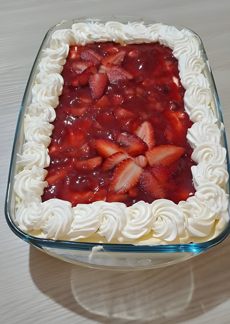 Een fris en romig dessert met lagen van pavesini, mascarponecrème en aardbeiensiroop. Perfect voor de lente of zomer!
