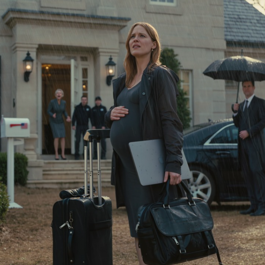 De regen doordrenkte mijn dunne zwangerschapsjurk terwijl mijn kleren om me heen waaiden en op het modderige gazon belandden. Ik drukte een hand tegen mijn acht maanden zwangere buik en leunde tegen de veranda-reling.