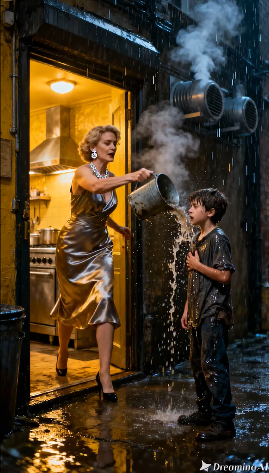 Ze sprak niet. Dat hoefde ook niet. Haar daden waren haar woorden, een taal van pure, onvervalste minachting. Ze pakte een emmer troebel, restwater van het aanrecht – het grijze, vette water waarmee ze na een dienst de voorbereidingstafel, vol met etensresten en vuil, afveegde – en zonder een spoor van aarzeling of gewetenswroeging gooide ze de hele inhoud in het gezicht van de jongen.