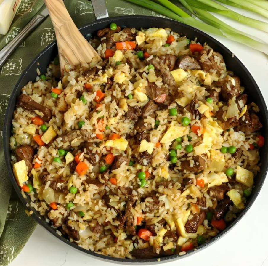 Deze heerlijke gebakken rijst met rundvlees is gevuld met mals gemarineerd biefstuk, eieren, groenten en gebakken rijst, alles overgoten met een zoete en hartige gembersaus.