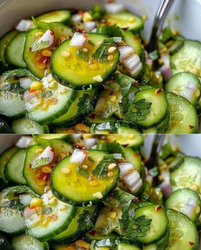 Snijd de komkommers dun met een mandoline of scherp mes en leg ze in een grote kom. Voeg de fijngehakte rode ui en knoflook toe voor extra smaak.