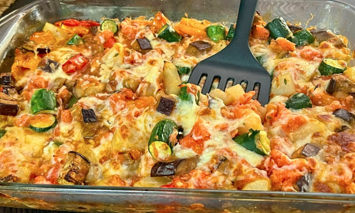 Deze geroosterde groenteschotel met aubergine, courgette, paprika’s, aardappelen en een rijke tomatensaus, afgewerkt met gesmolten kaas, is een heerlijk en stevig gerecht dat elke eter blij maakt. De combinatie van zachte, geroosterde groenten en een warme, aromatische saus zorgt voor een diepe, huiselijke smaak. Ideaal als vegetarisch hoofdgerecht of als extra smaakvol bijgerecht naast vlees, vis of een frisse salade.