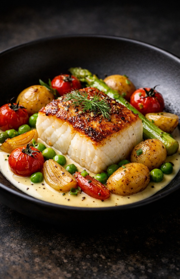 Bereiding van geroosterde kabeljauwfilet, romige kruidensaus en jonge groenten