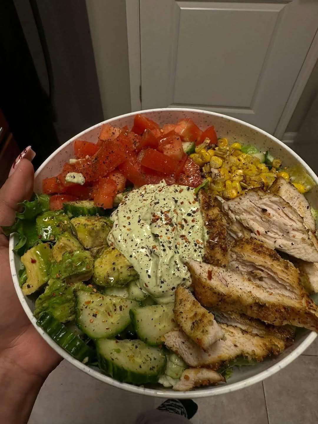 Dit gerecht is een heerlijke en voedzame kip-avocado salade bowl 🥗🐓, perfect voor een gezonde maaltijd vol smaak! Hier is een recept om deze kleurrijke en smakelijke bowl thuis te maken: