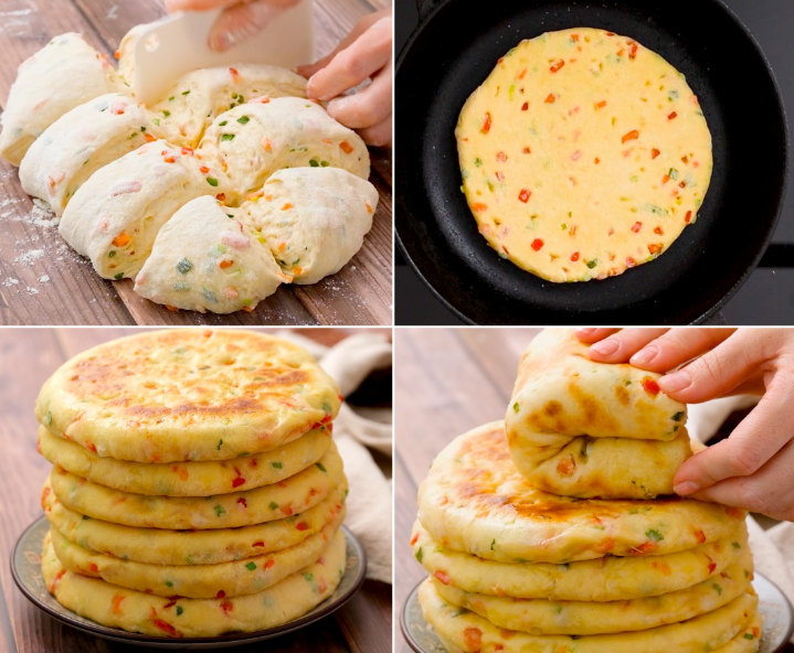 Om het te bereiden heb je wortels, paprika’s, bosuien en een handvol basisproducten nodig zoals bloem, bakpoeder, zout en olijfolie. De groenten worden in kleine blokjes gesneden en door het deeg gemengd, waardoor ze gelijkmatig worden verdeeld en tijdens het bakken zacht worden. Zodra het deeg heeft gerust en licht is gerezen, is het klaar om in de pan te bakken tot een warm, licht knapperig en heerlijk geurend platbrood.