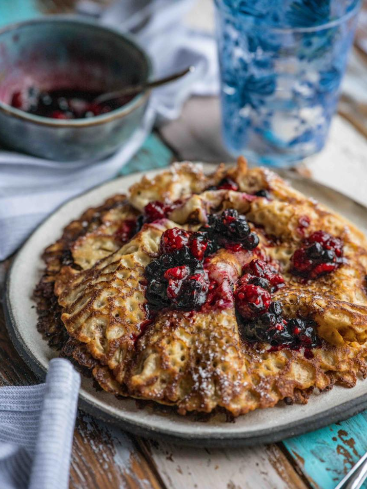 Bij deze pannenkoeken maakte ik zelf rauwe bessen met honing: ongeveer 2 dl bessen gemengd met 2 eetlepels honing. Een snelle topping die fris, zoet en ontzettend lekker is bovenop de warme pannenkoeken. Maar ook met kwark, jam of een simpele snuf poedersuiker zijn ze heerlijk. Dankzij de vezels en het graanige karakter zijn ze ideaal voor ontbijt of lunch — precies het soort maaltijd dat je de rest van de dag een goed gevoel geeft.