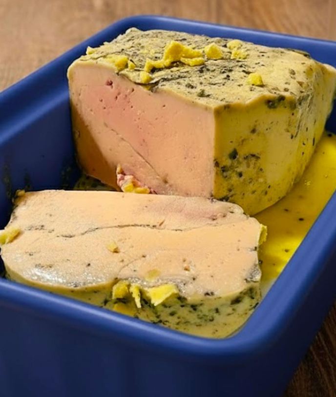 Halfgare foie gras, ook wel foie gras « in een terrine » genoemd, onderscheidt zich door het zachte en gecontroleerde kookproces, waardoor de gladde textuur en delicate smaak behouden blijven. In tegenstelling tot foie gras uit blik, behoudt het een onvergelijkbaar smeltende textuur en een frisheid die zelden te vinden is in industriële producten. Het geheim? Koken in een waterbad op een lage temperatuur en een cruciale rustperiode die de aroma’s de kans geeft zich volledig te ontwikkelen.