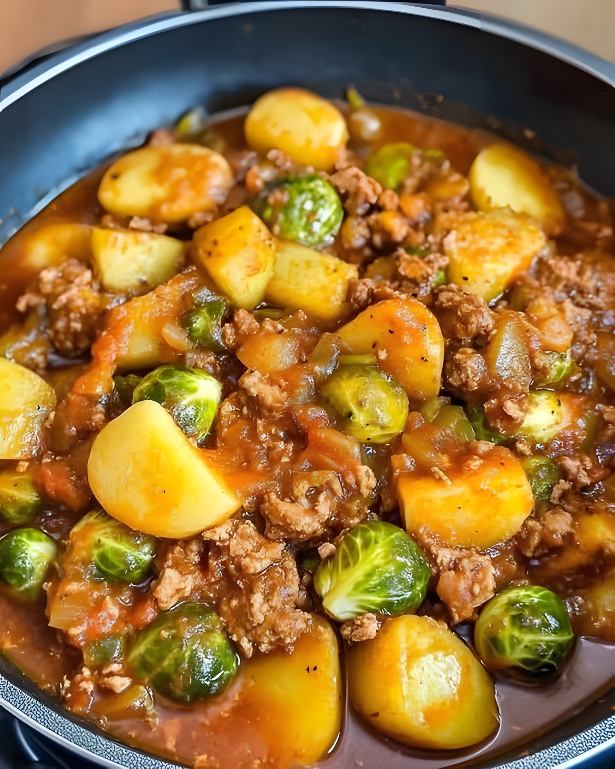 Een smaakvolle en voedzame eenpansmaaltijd met spruitjes, aardappelen en gehakt in een rijke tomatensaus. Perfect voor koude dagen en een heerlijke manier om meer groenten te eten!