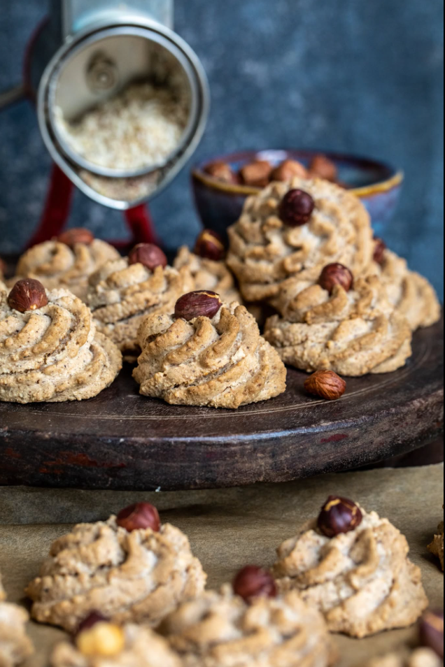 Het basisrecept voor deze notenkoekjes met hazelnoten draait om eenvoud. Door de hazelnoten te malen of kant-en-klaar hazelnootmeel te gebruiken, ontstaat er een fijn mengsel dat luchtig combineert met poedersuiker en eiwit. Het beslag wordt stevig genoeg om te spuiten, maar blijft soepel zodat de koekjes een mooie ronde vorm behouden. Tijdens het bakken krijgen ze een licht glanzende bovenkant en kleuren ze geleidelijk goudbruin, een teken dat de buitenkant krokant wordt terwijl de binnenkant zacht blijft.