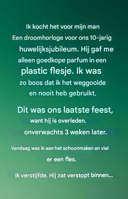 Drie weken later overleed hij. Geen waarschuwing, geen tijd om je voor te bereiden – alleen een telefoontje dat alles verpestte. In de dagen daarna zwierf ik als een schaduw door ons huis. Zijn mok stond nog steeds op het aanrecht. Zijn jas hing bij de deur. En in die lade, onaangeroerd, lag parfum. Elke keer dat ik naar hen keek, werd het verdriet dieper. Ik had iets afgewezen wat hij me met liefde had gegeven, en nu zou ik nooit de kans krijgen om hem te vertellen hoeveel hij voor me betekende.