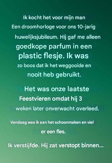Drie weken later overleed hij. Geen waarschuwing, geen tijd om je voor te bereiden – alleen een telefoontje dat alles verpestte. In de dagen daarna zwierf ik als een schaduw door ons huis. Zijn mok stond nog steeds op het aanrecht. Zijn jas hing bij de deur. En in die lade, onaangeroerd, lag parfum. Elke keer dat ik naar hen keek, werd het verdriet dieper. Ik had iets afgewezen wat hij me met liefde had gegeven, en nu zou ik nooit de kans krijgen om hem te vertellen hoeveel hij voor me betekende.
