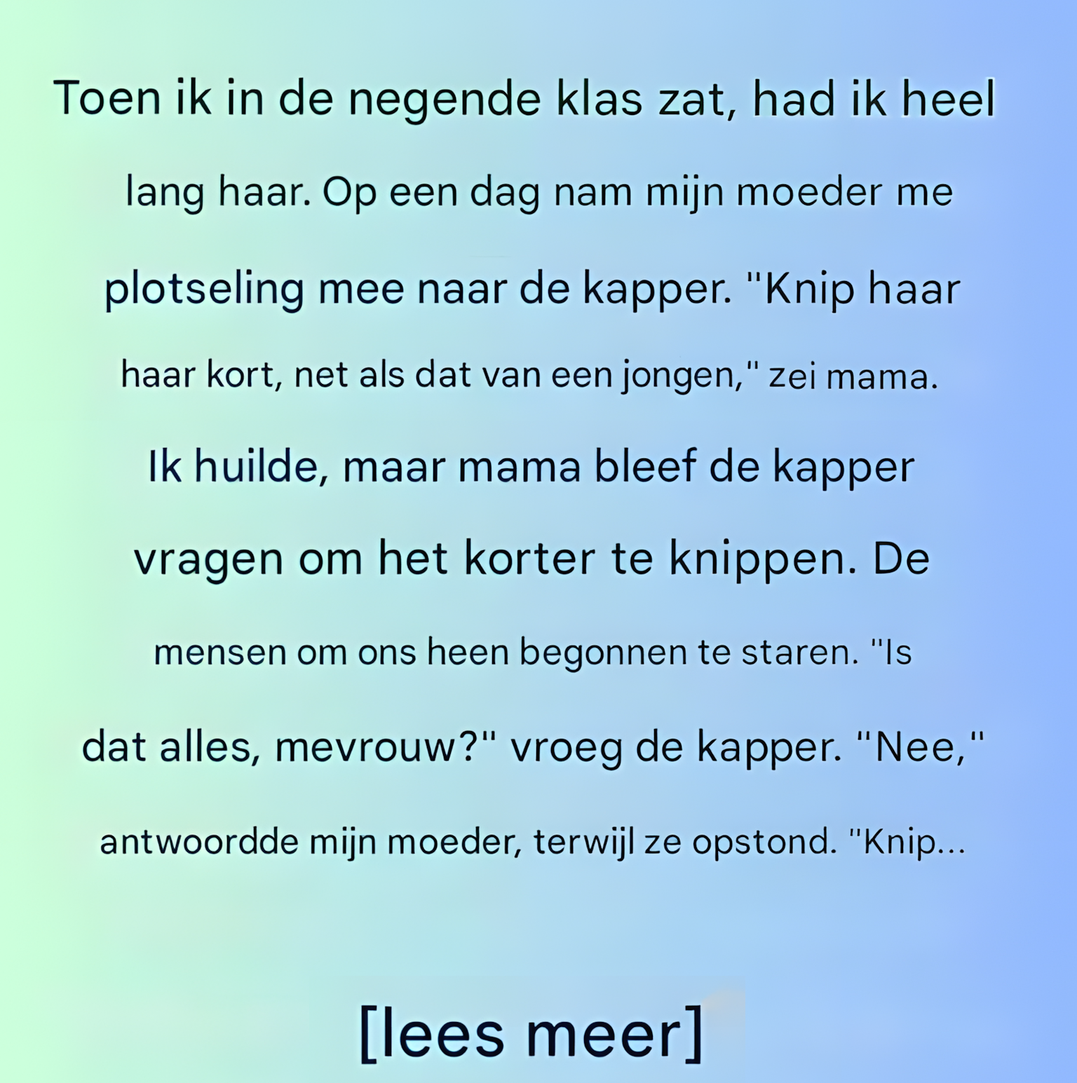 Mijn moeder merkte de verandering in mij niet. Of misschien wel, maar het kon haar niets schelen. Ze werkte lange dagen en kwam moe thuis, klagend over geld, haar baas of mijn ondankbaarheid. Op een avond verzamelde ik de moed om haar te vragen waarom ze me mijn haar had laten knippen. Ze keek me kil aan en zei: « Je werd te ijdel. Ik wilde je een lesje leren. » Toen pakte ze haar telefoon weer. Ik herinner me dat ik die avond naar bed ging met het gevoel dat er iets in me gebroken was.