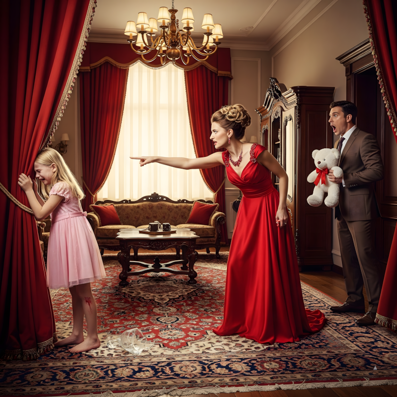 In plaats daarvan stond Victoria—haar stiefmoeder, gehuld in een scharlakenrode avondjurk—boven haar met een vinger die als een mes wees. “Jij onhandig, ondankbaar kind! Heb je enig idee wat je verpest hebt? ze spuugde, haar stem druppelde van minachting. De grootsheid van de kroonluchter boven, het gepolijste meubilair en de rijkdom van de kamer versterkten alleen maar de wreedheid in haar toon. Dit huis had alles wat geld kon kopen, behalve liefde voor Lily.