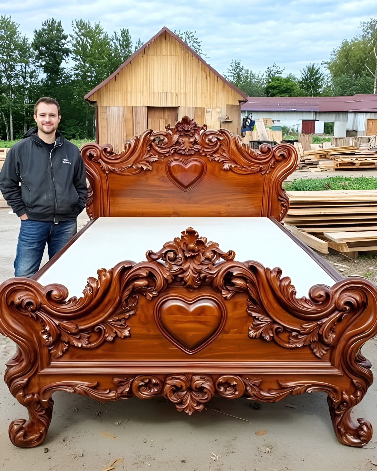 Naast dit bed staat de maker zelf, trots maar bescheiden. Hoeveel mensen hebben voorbijgelopen zonder het verhaal achter dit meesterwerk te vragen? De handen die dit bed hebben gemaakt, vertellen het echte verhaal: lange uren in de werkplaats, het zorgvuldig selecteren van hout, en de creatieve visie om iets unieks te creëren.