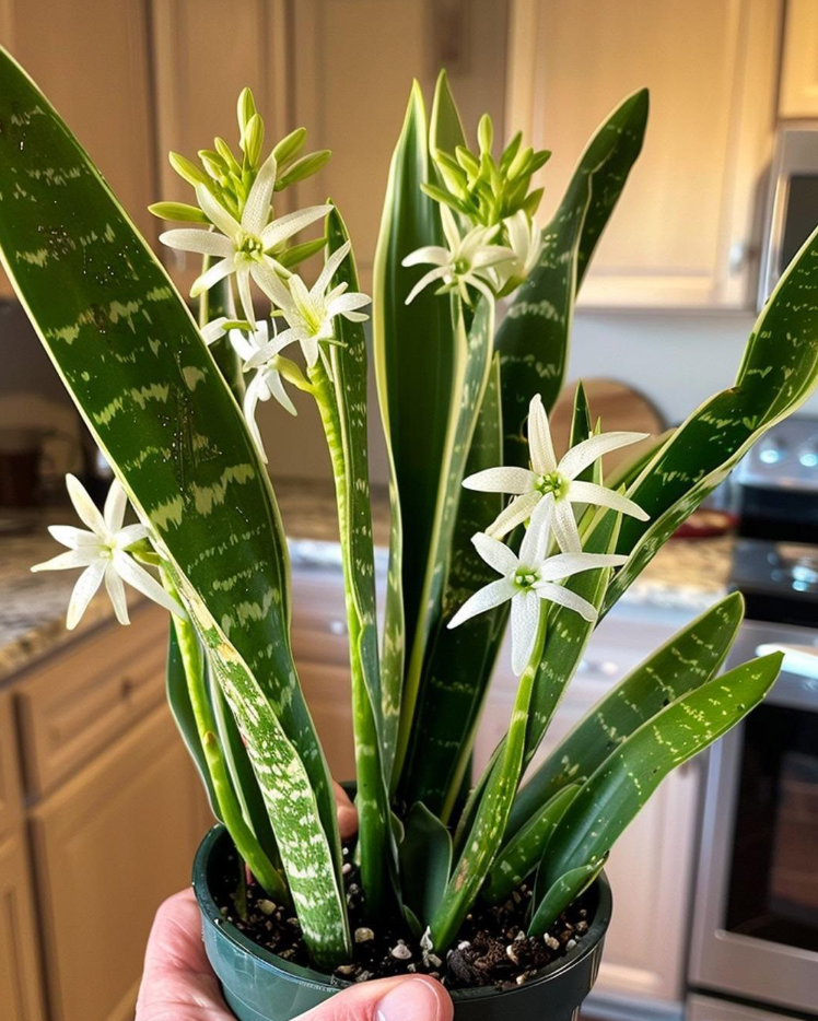 Als je denkt dat de sansevieria – soms gekscherend ook wel ‘schoonmoeders tong’ genoemd – slechts een bijna onverwoestbare sierplant is, dan heb je het mis. Op een zomerochtend werd ik bij binnenkomst in mijn woonkamer begroet door een verrassend zoete, bijna vanille-achtige geur. Na een paar minuten zoeken naar een vergeten kaars of een geurverspreider die ik per ongeluk had aangezet, begreep ik het eindelijk: mijn sansevieria stond net in bloei.